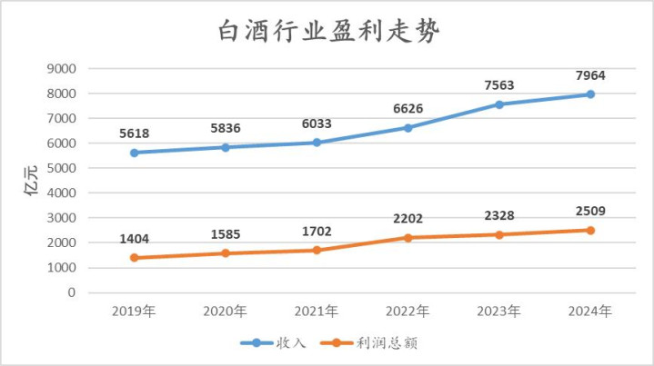2019年-2024年,国内规模以上企业白酒产量从786万千升下降到415万千升,近乎腰斩,但同期白酒行业的销售收入却从5618亿元增长至7964亿元,同比增长约42%;利润总额从1404亿增长至2509亿,同比增长78.7%。